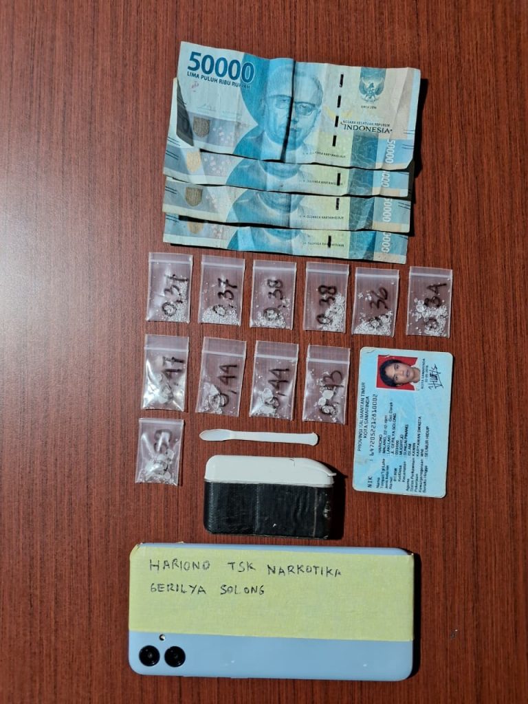 Secara keseluruhan, barang bukti yang berhasil diamankan berupa 11 bungkus plastik bening berisi sabu dengan total berat 4,57 gram bruto, satu sendok penakar, satu unit handphone merek Samsung, serta uang tunai sebesar Rp200.000,- yang diduga hasil transaksi narkotika.