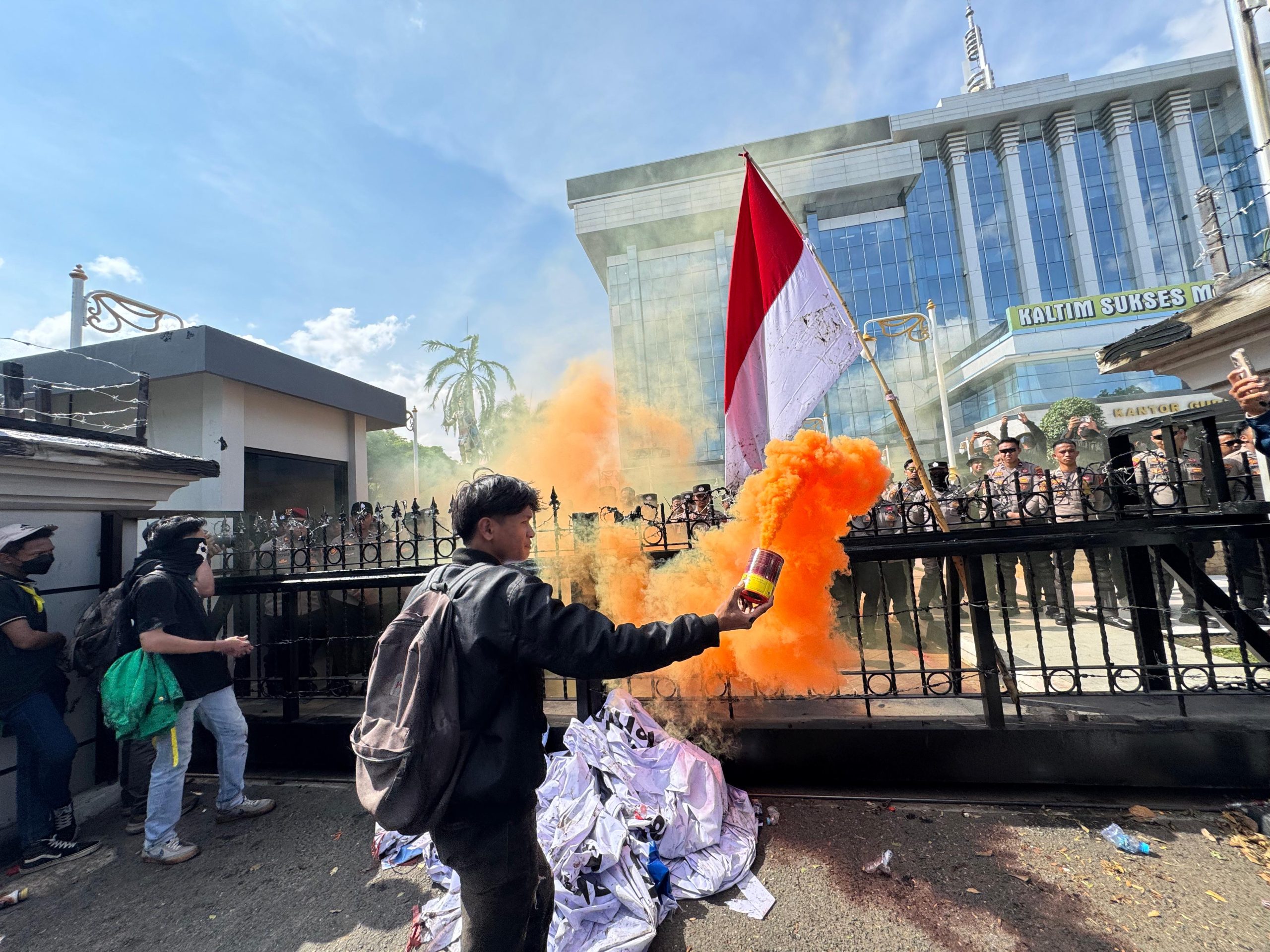 Timesnusantara.com – Samarinda, 21 April 2026 – Aksi demonstrasi yang berlangsung di depan Kantor Gubernur Kalimantan Timur diwarnai insiden ketika seorang terduga provokator menyalakan asap dari bom kaleng di tengah massa aksi, Selasa (21/4).